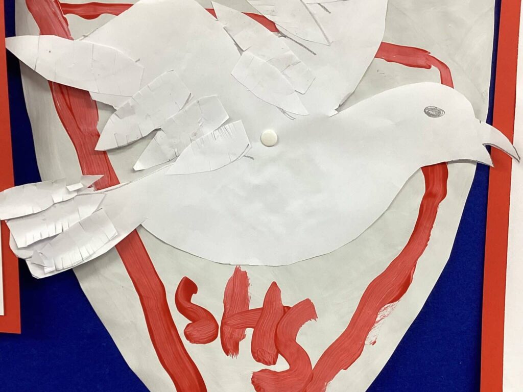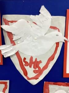 We had great fun searching the school for signs of the seagull and began noticing it in so many places such as on our blazers, PE kit, school bags, important pieces of paper and in so many other places around the school. We had some fun afternoons making our own versions of the school crest using paint and paper to represent the seagull. We carefully cut out some feathers and added snips to make them textured using scissors and then stuck them to our crest to add some depth. scissors.