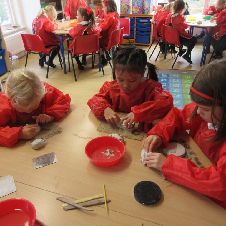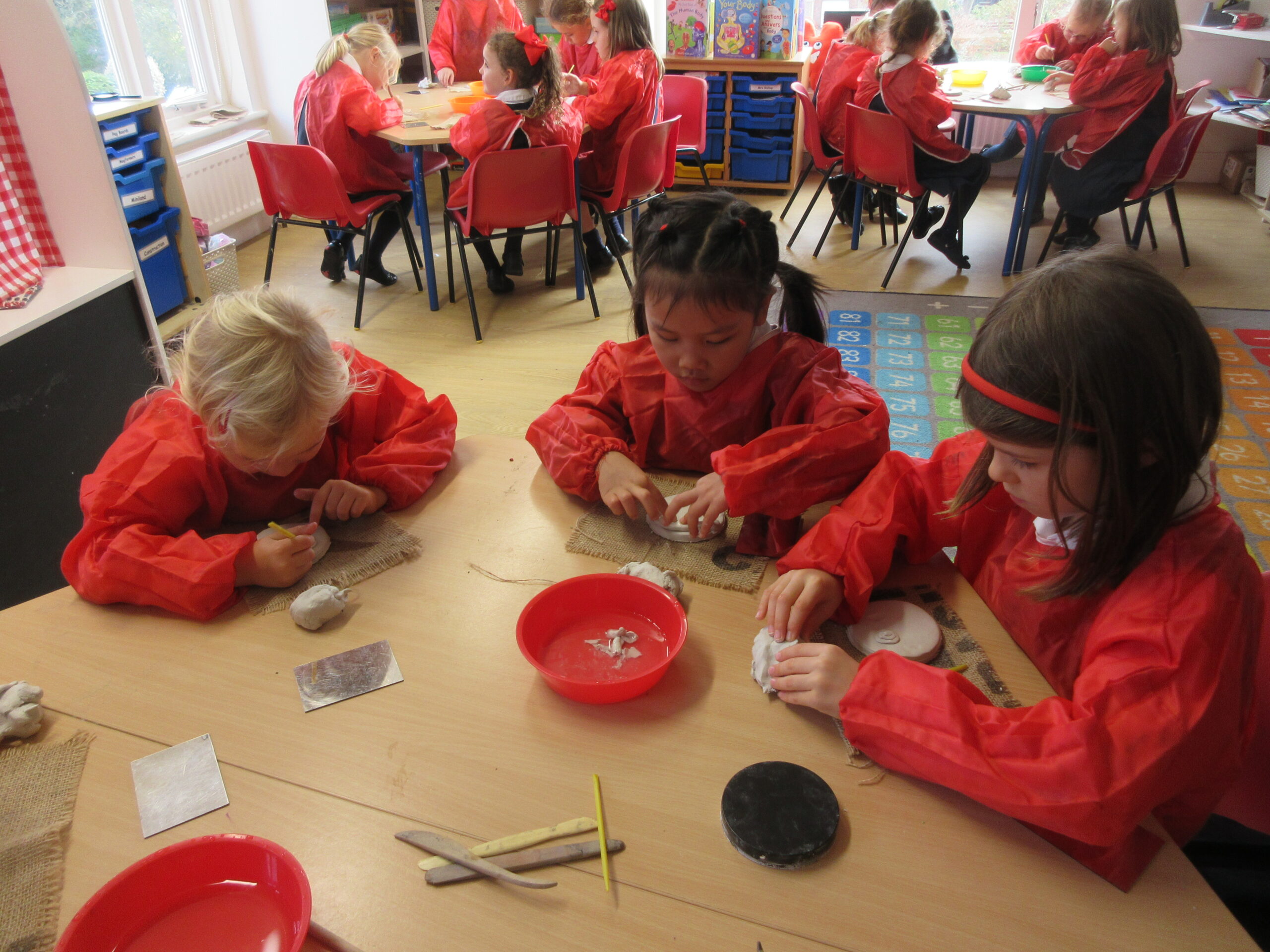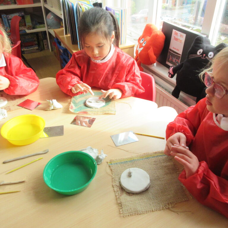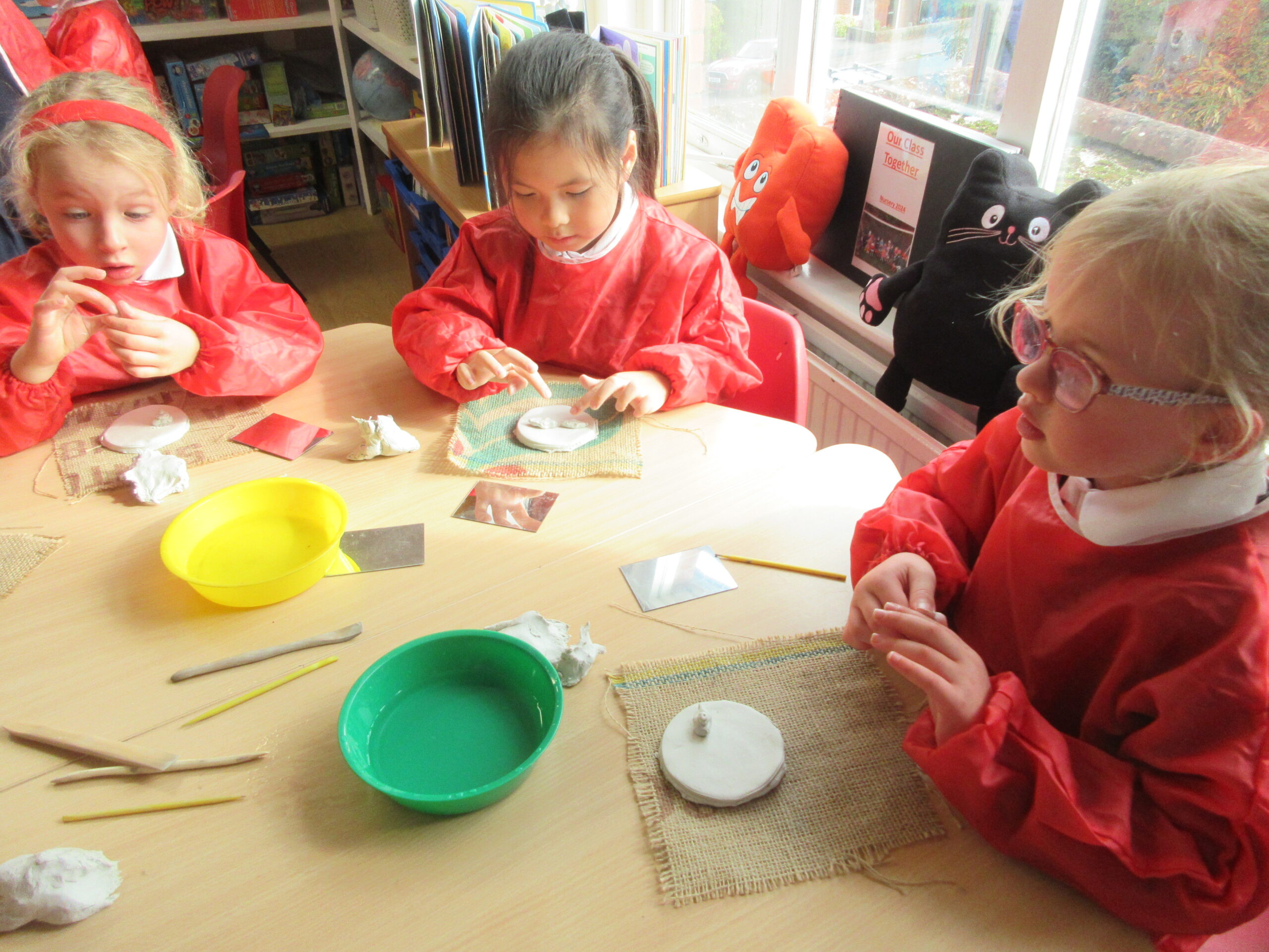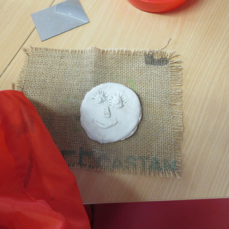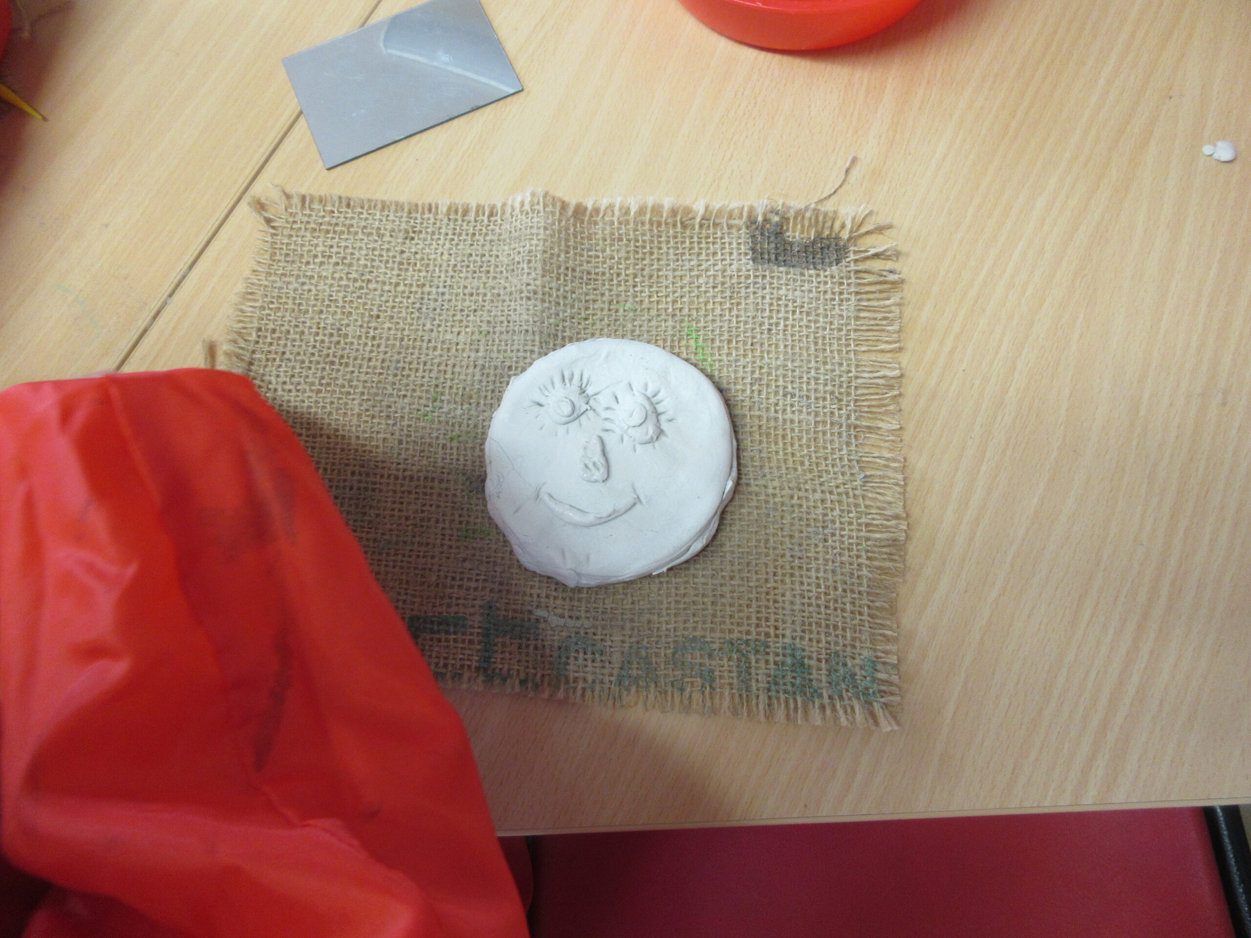The following week we were feeling brave, and got out the clay! We used the clay to make our own face portraits, using a mixture of clay and water to make ‘slip’ to stick on our features. We can’t wait to paint them once they are dry.