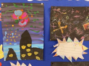 We each worked very hard to hear the correct sounds in these words and wrote them as a poem. We also used paint and chalks to create some marvellous pieces of artwork.