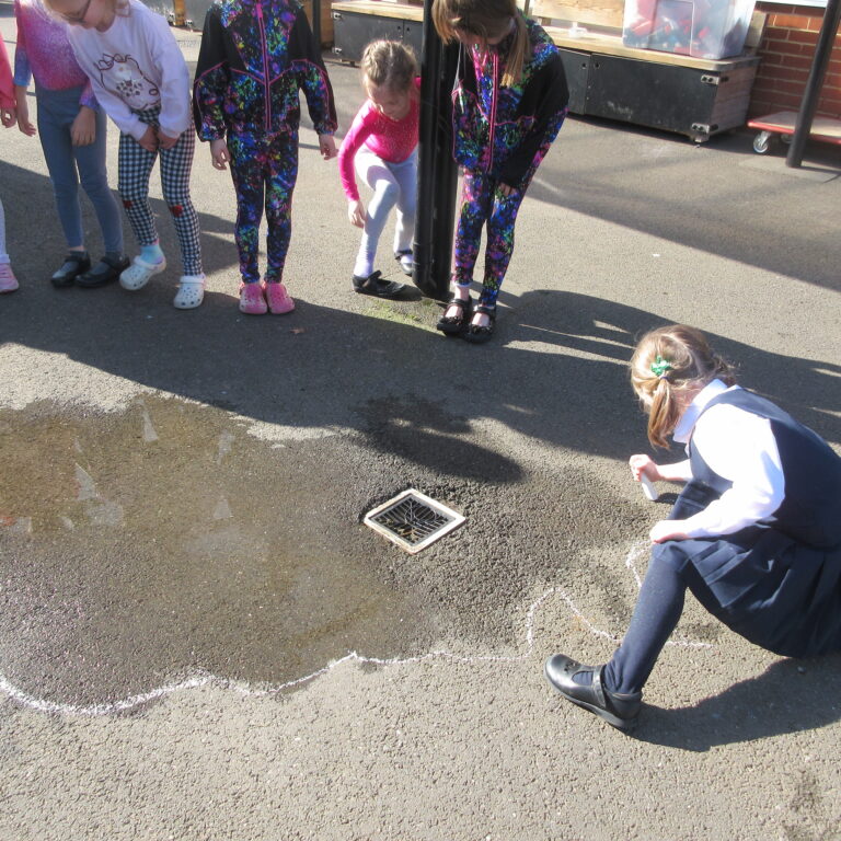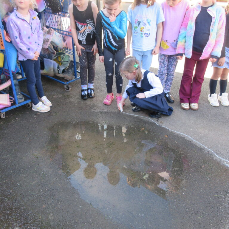 We learnt about the water cycle and ventured out to find the biggest puddle on the playground. We chalked around the puddle, and waited to see what would happen to it over a few days. We were delighted to see that the water had evaporated by the warm spring sun!