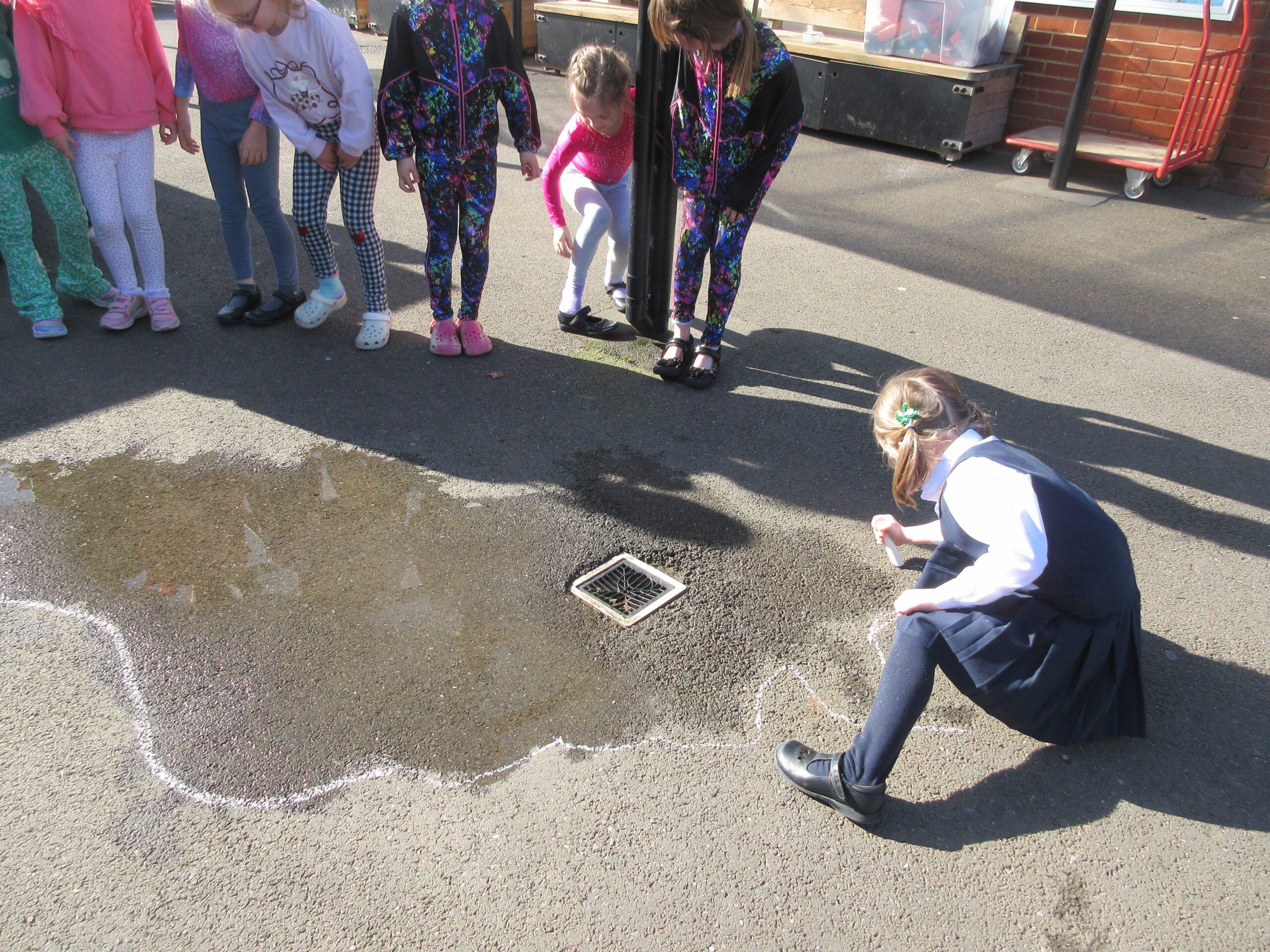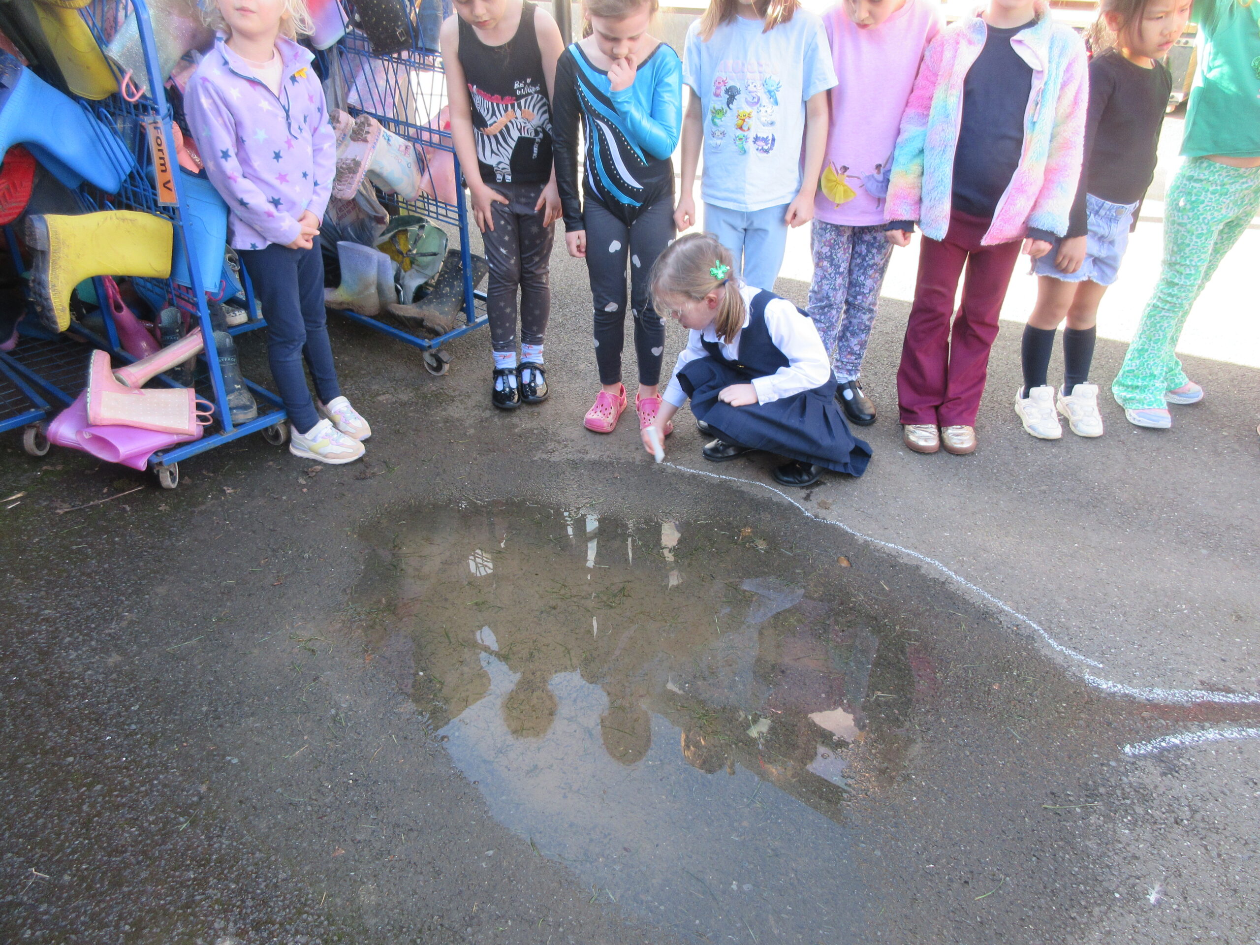 We learnt about the water cycle and ventured out to find the biggest puddle on the playground. We chalked around the puddle, and waited to see what would happen to it over a few days. We were delighted to see that the water had evaporated by the warm spring sun!